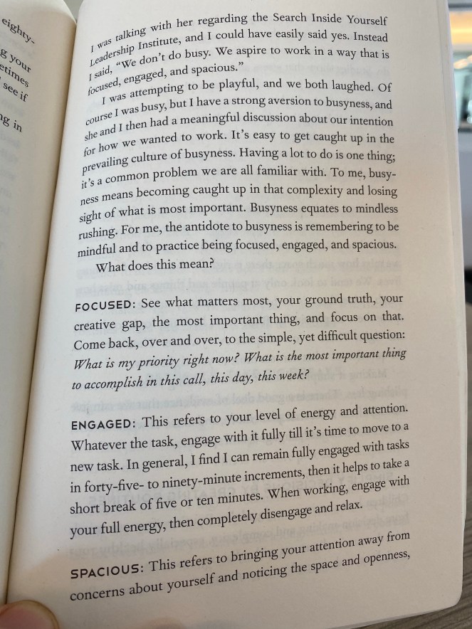 Luckily Lesser shares my aversion to promoting busyness, “To me, busyness means becoming caught up in that complexity and losing sight of what’s important. Busyness equates to mindless rushing. For me, the antidote to busyness is remembering to be mindful and to practice being focused, engaged, and spacious.” Here’s what he means by focused, engaged, and spacious: